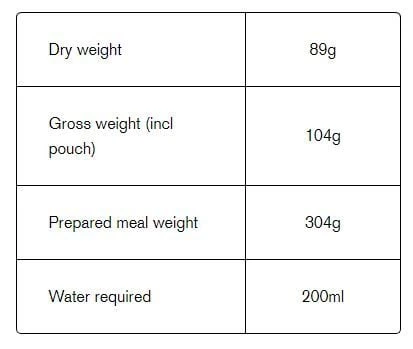 Preparation: REMOVE THE OXYGEN ABSORBER (Sachet) from inside the pouch. Slowly add up to 200ml hot water, stirring as you pour and then close the bag. Wait 5-8 minutes for the food to rehydrate.
