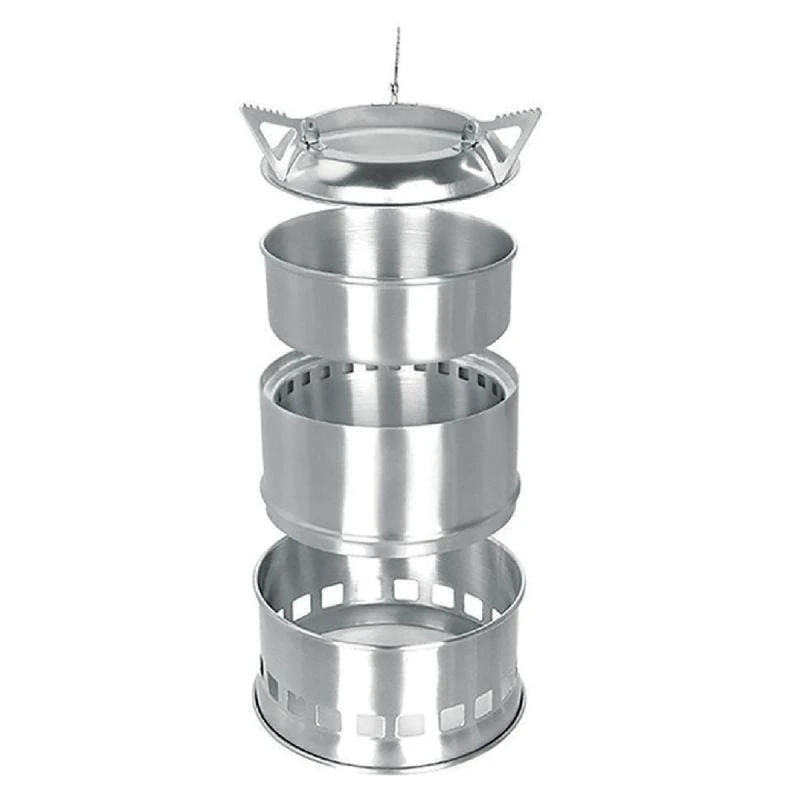 Lightweight and compact at only 380g Durable Stainless Steel construction. Consists of 5 detachable parts which can be stored inside each other for easy transportation and storage. No need to carry fuel as this stove uses wood. Wide opening makes adding fuel easy.