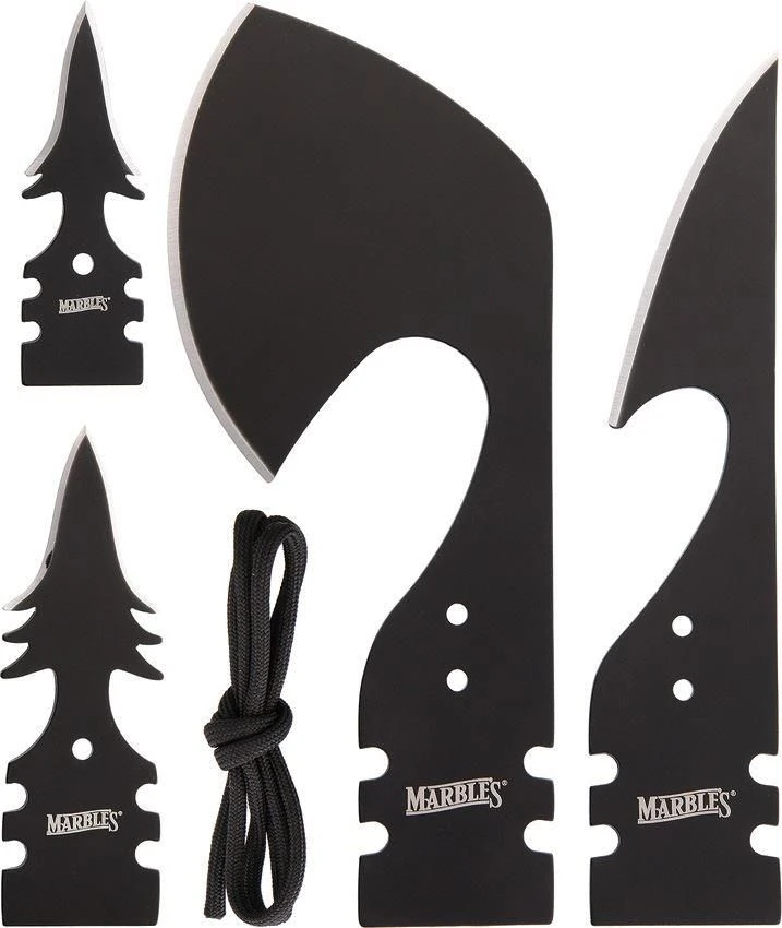 Marbles MR381 Wilderness Survival Set. Four piece set. Includes harpoon head, hand axe with Ulu head, 6-barb fishing head, 4-barb fishing head, and starter length of paracord. All tools are black finish stainless construction.