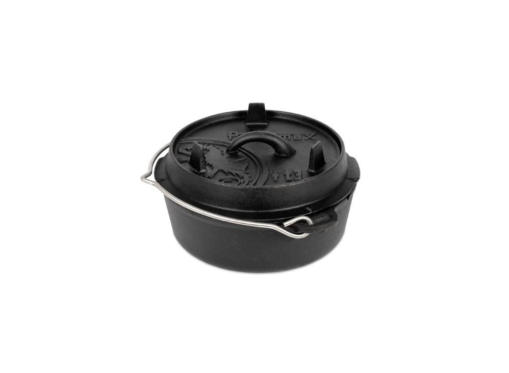 Thanks to the amazing characteristics of cast iron and the special structure of the surface, warmth is efficiently stored and distributed. The pre-treated surface (seasoned finish) makes a first seasoning unnecessary, and the sturdy Dutch oven can be used right away. In the open air, it is used on an open fire or with charcoal and briquettes. The raised edge of the lid makes it possible to place embers or charcoal also on the Dutch oven. The Dutch oven is thus heated from all sides and is for example suitable for baking bread.