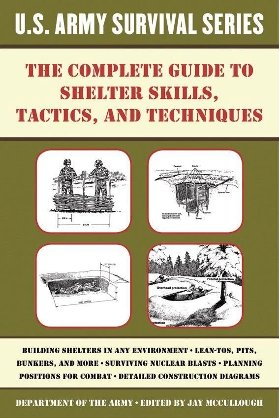 62 page paperback. Survival Guide to Shelter Skills, Tactics, and Techniques. Instructions for how to build shelters in any environment, survive nuclear blasts, plan positions for combat, and much more. Department of the Army, edited and with a foreword by Jay McCullough.